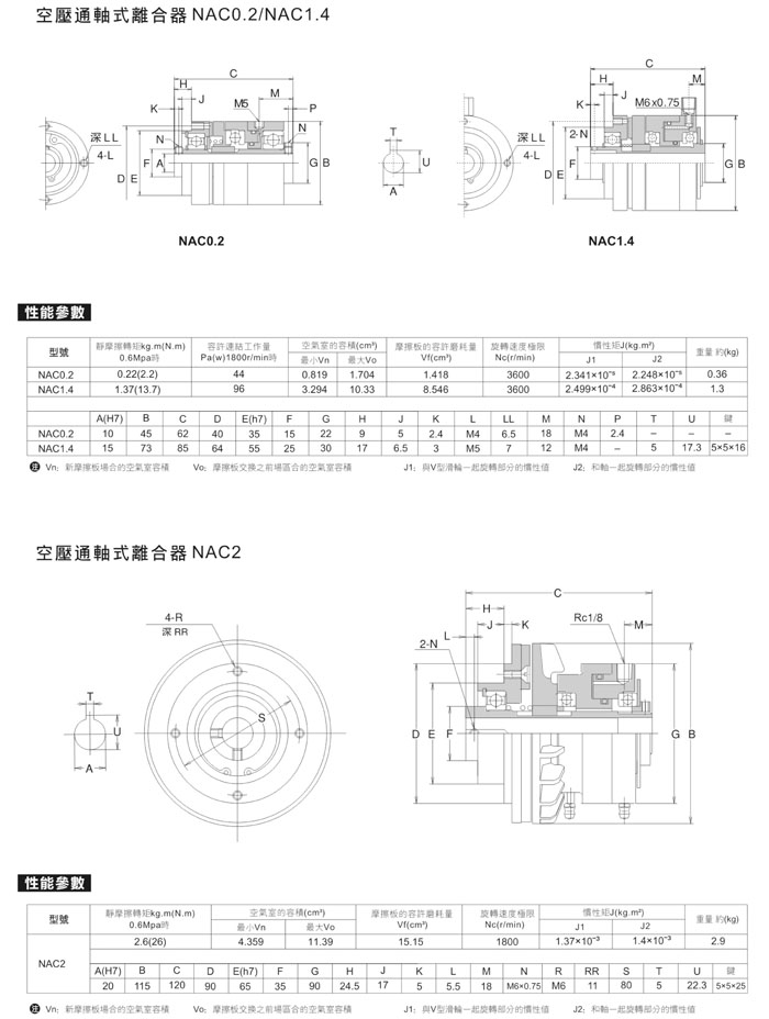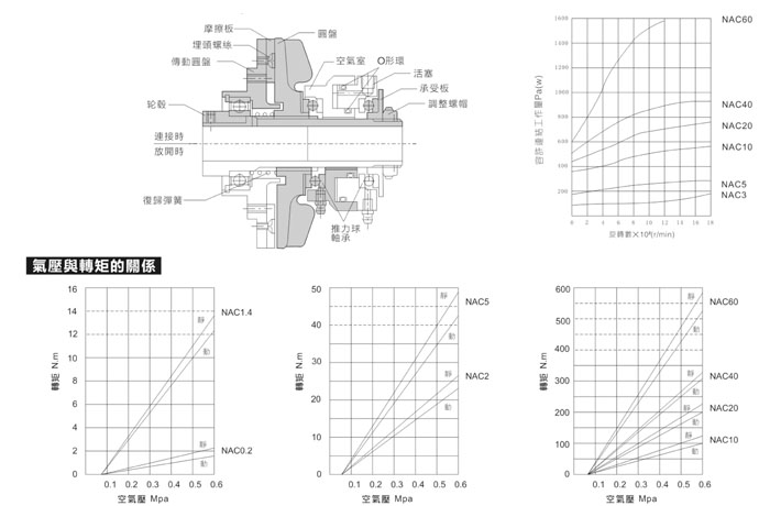 NAC型空壓離合器靠空氣連接,靠復歸彈簧來放開。圓盤靠空氣壓沿軸向方向滑動,接觸摩擦板。圓盤、摩擦板等組裝到輪轂上,成為一體化結構。摩擦板可用擰開調整螺帽的方式進行拆解,更換簡單。